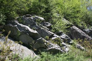 In contrast, the brown and barn-red rocks of the Connecticut River lowland were formed when the weather-beaten residues of these originally tough rocks washed together as layers of gravel, sand and mud that were later pressed tightly together, then even later cemented by rust, which accounts for their earthy hues. These are the familiar tilted layers of brownstone that peek out at us from roadcuts and excavations throughout the central valley, and which are proudly exhibited in landmark buildings all over the Northeast (for example, Hartford’s Asylum Hill Congregational Church). The most famous “brownstone” of all, however, is a bedrock slab in Rocky Hill that — in a successful architectural juxtaposition of material and form — is carefully protected beneath an aluminum geodesic dome at Dinosaur State Park. There, the mica-laden mud contains dinosaur footprints called Eubrontes, Connecticut’s state fossil.